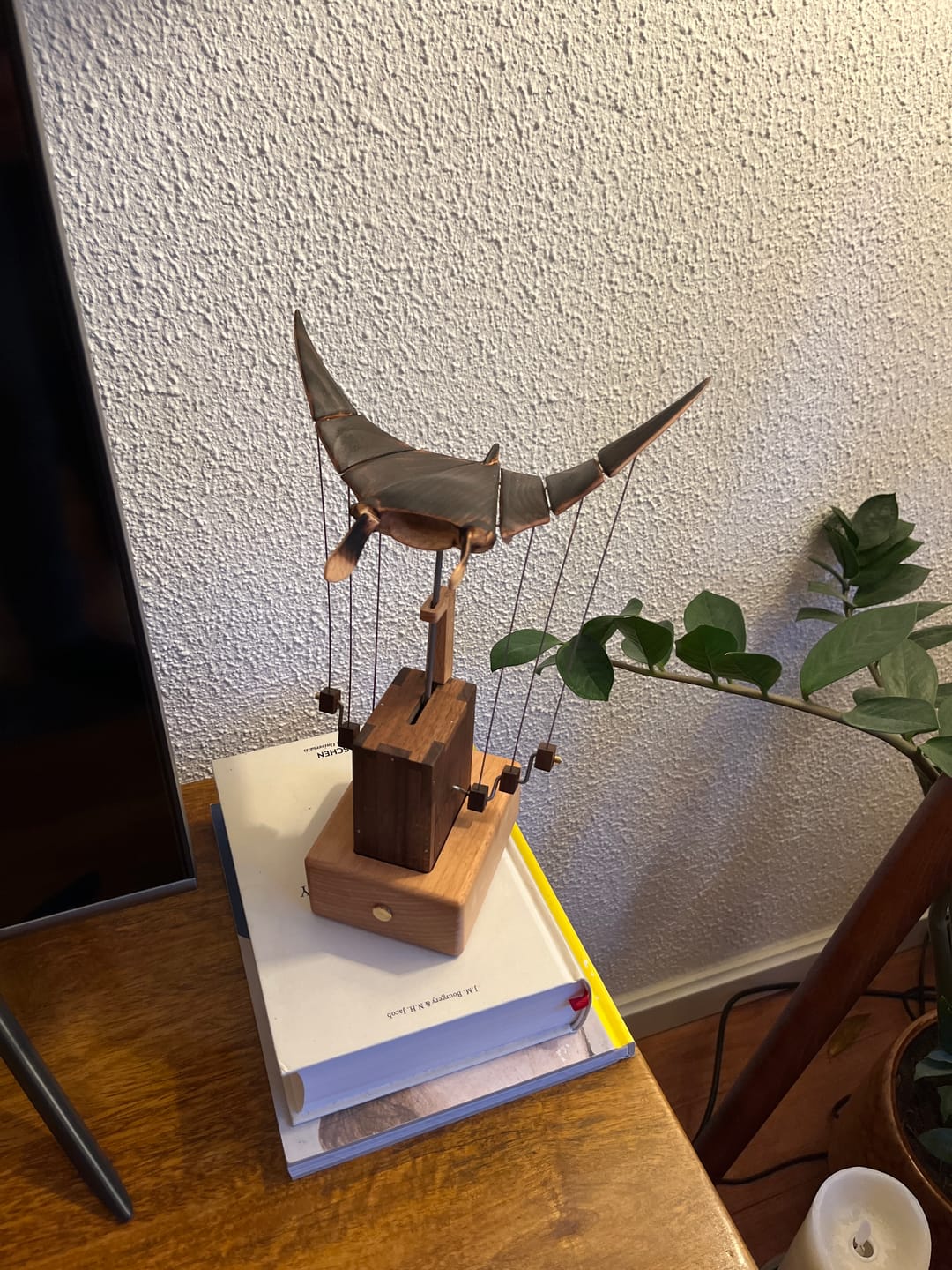Sale ending inThis automata brings the graceful movement of a manta ray to life. Crafted from beech wood and walnut, with the back finished through a carbonized technique, it highlights the natural beauty of the wood while adding a refined touch.